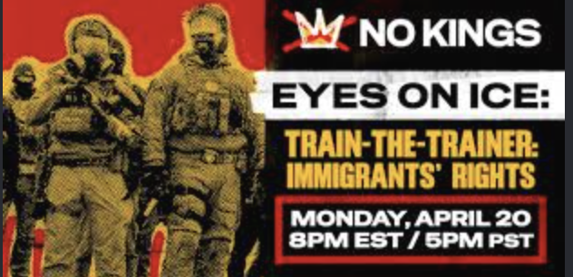 Support Train the Trainer Event for NO KINGS: Eyes on ICE event, April 20, 2026 at 8 pm EST.